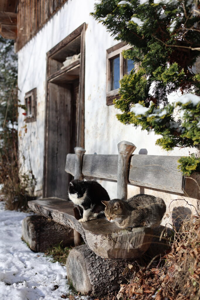 Viele Tiere, wie Enten, Hühner, Kälber, Rinder und Katzen werden am Hof gehalten.